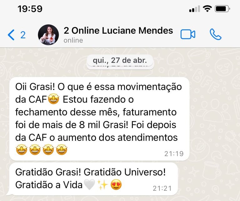 “Depois que teve filhos começou a deixar o esposo de lado, na segunda gravidez percebeu que o relacionamento já não era mais o mesmo, reclamava demais, estava sempre irritada, com dores no corpo causadas pela fibromialgia, se sentia usada pelo marido e não conseguia se entregar nas relações amorosas. Depois que começou a olhar para dentro de si, liberar crenças limitantes com os movimentos sistêmicos, hoje ela e o marido voltaram a conversar mais, dedicam um tempo só deles e a relação sexual deixou de ser um problema. Se sente leve, feliz e com a sensação que voltou pra casa.”